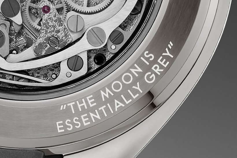 Su esfera esqueletizada muestra un paisaje lunar grabado con láser, con el lado visible en el anverso y el oculto en el fondo de la caja.